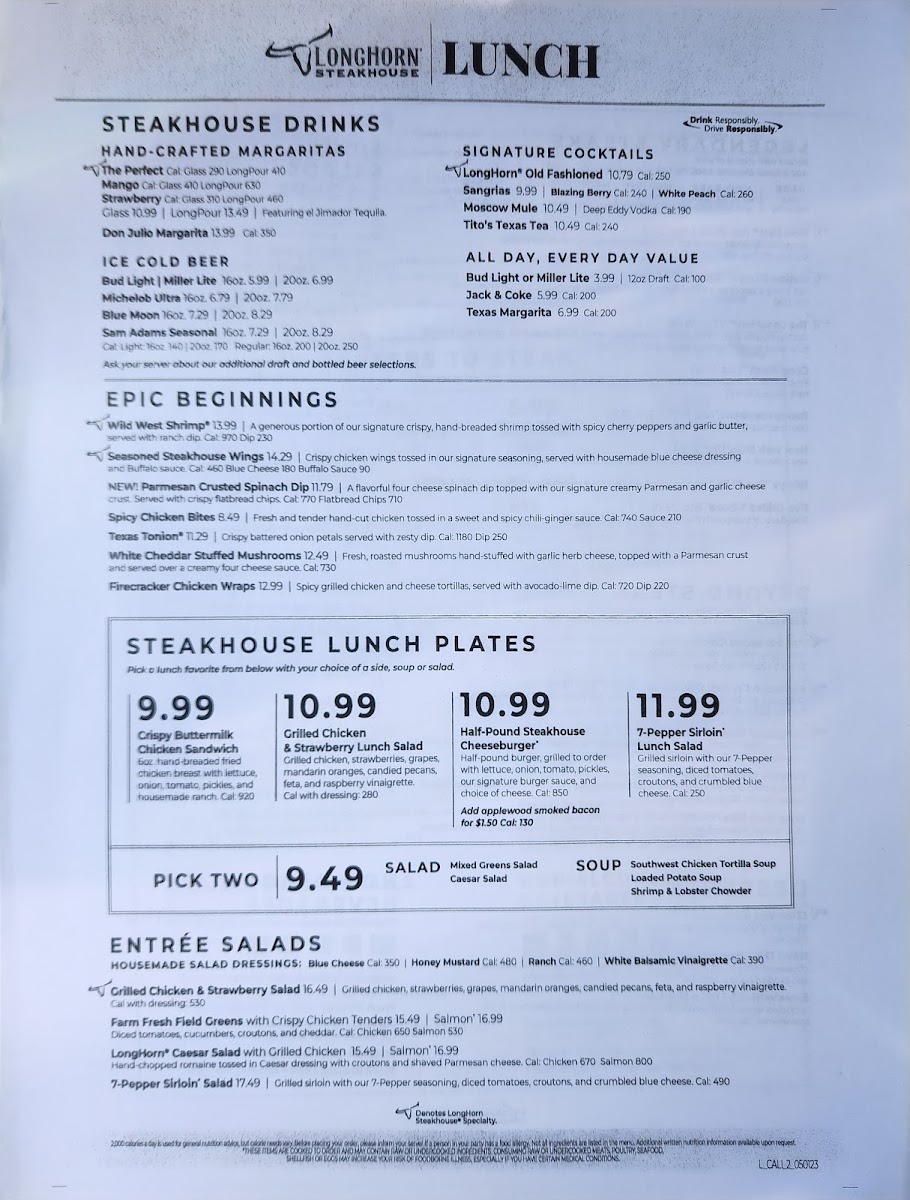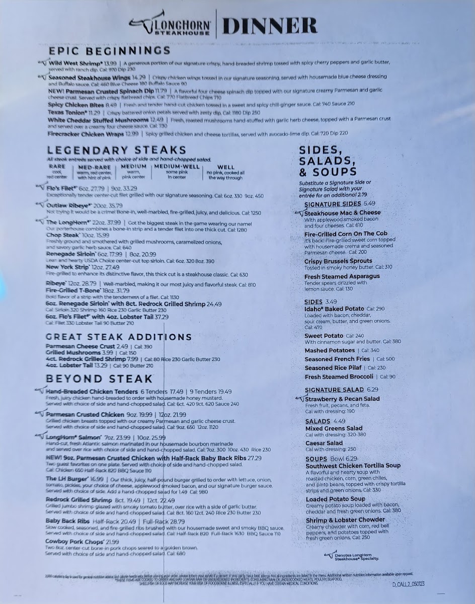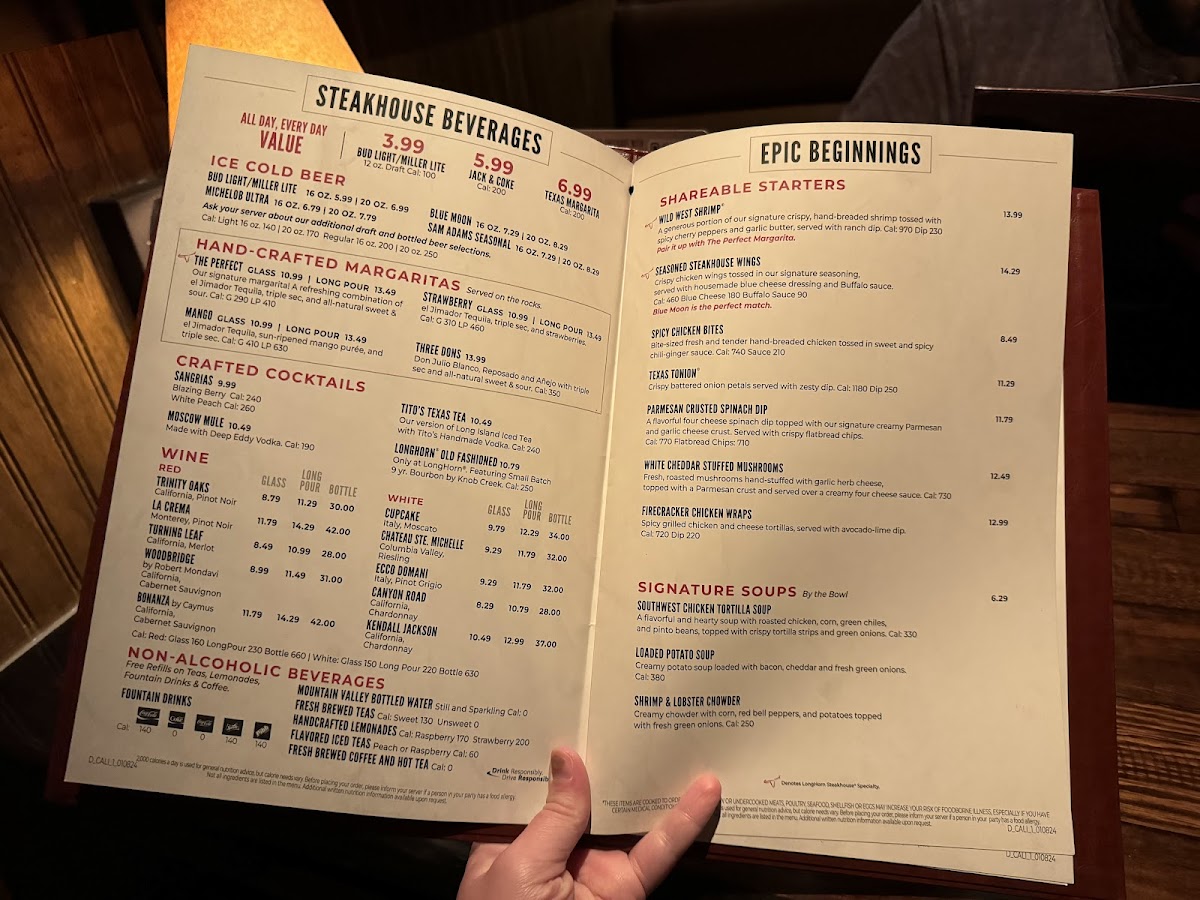 LongHorn Steakhouse in Temecula offers a robust menu that celebrates classic American flavors with a modern twist. The standout “Parmesan Crusted Spinach Dip” is a creamy blend of four cheeses, topped with a signature Parmesan and garlic crust, paired perfectly with crispy flatbread chips. For starters, the seasoned Steakhouse Wings deliver a bold kick alongside housemade blue cheese and Buffalo sauce, creating a rich contrast of flavors. The Wild West Shrimp exemplifies their dedication to handcrafted quality, featuring crispy, hand-breaded shrimp tossed in a signature seasoning that keeps guests coming back. The steakhouse shines brightest with its expertly grilled steaks—cooked to perfection, juicy, and bursting with flavor—earning rave reviews for taste and presentation. Complemented by attentive service and a lively atmosphere, LongHorn Steakhouse promises a satisfying dining experience, whether enjoyed with family, friends, or solo. This menu balances hearty tradition with elevated, memorable dishes that honor its barbecue and grill heritage.